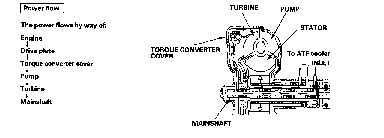 Fluid entered from the chamber between the torque converter cover and the torque converter clutch piston passes through the torque converter and goes out from the chambers between the turbine and the stator, and between the pump and the stator. As a result, the torque converter clutch piston moves away from the torque converter cover, and the torque converter clutch lock-up is released; torque converter clutch lock-up OFF.