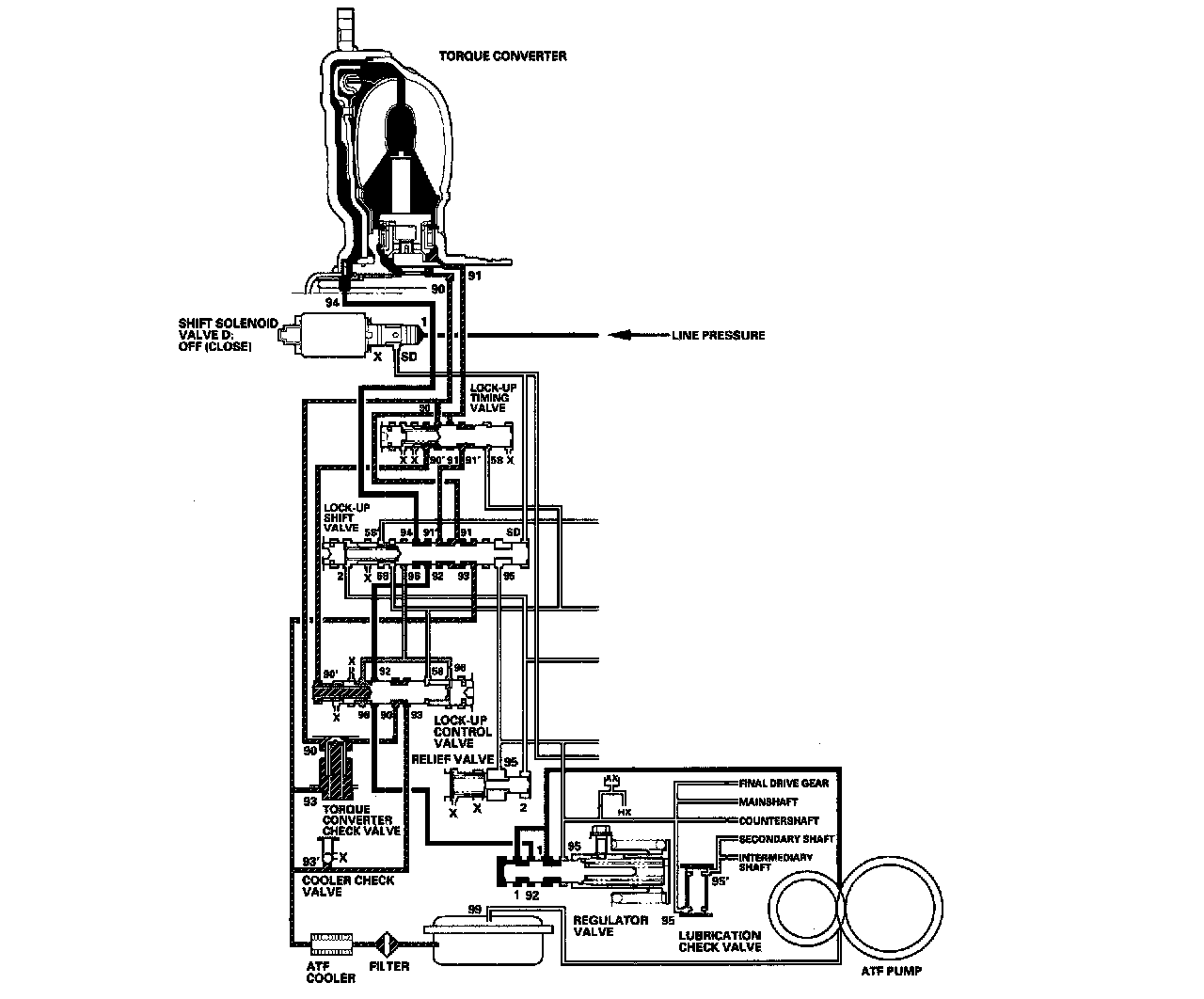 The PCM commands shift solenoid valve D to remain OFF, and shift solenoid valve D covers the port of shift solenoid valve D pressure (SD) to the lock-up shift valve. The lock-up shift valve is in the right side, and uncovers the port leading torque converter pressure (92) to the left side of the torque converter. Torque converter pressure (92) from regulator valve becomes torque converter pressure (94) at the lock-up shift valve, and enters into the left side of the torque converter to disengage the torque converter clutch. The torque converter clutch is OFF.