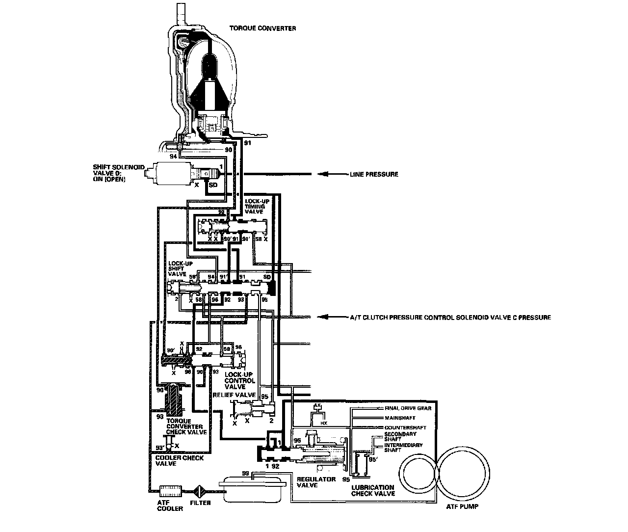 As the speed of the vehicle reaches the programmed value, the PCM turns shift solenoid valve D ON, and shift solenoid valve D uncovers the port of shift solenoid valve D pressure (SD) to the lock-up shift valve. The lock-up shift valve is moved to the left side to uncover the port of torque converter pressure (91) leading to the right side of the torque converter to engage the torque converter clutch. The PCM also controls A/T clutch pressure control solenoid valve C, and A/T clutch pressure control solenoid valve C pressure (58) is applied to the lock-up control valve and lockup timing valve. When A/T clutch pressure control solenoid valve C pressure (58) is lower, torque converter pressure (91) from the lock-up control valve is lower. The torque converter clutch is engaged partially. A/T clutch pressure control solenoid valve C pressure (58) increases, and the lock-up timing valve is moved to the left side to uncover the port leading torque converter pressure to high. Under this condition, the torque converter clutch is engaged by pressure from the right side of the torque converter; this condition is partial lock-up.