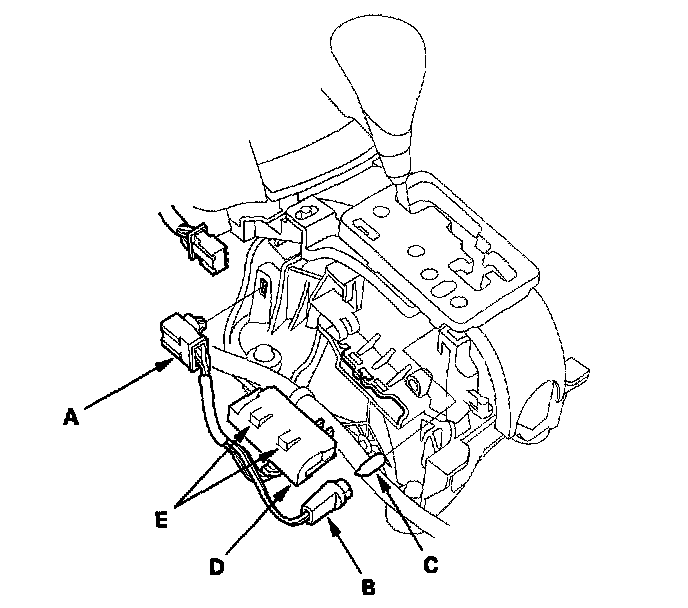4. Remove the transmission gear selection switch/park pin switch (D) by releasing the lock tab (E).