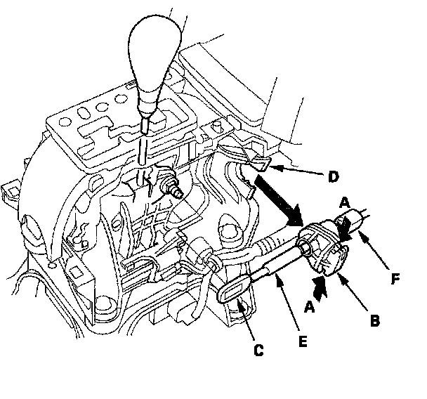 4. Press the holder lock release (A), and pull out the socket holder (B) to remove the shift cable (C) from the shift lever bracket base (D). Do not remove the shift cable by pulling the shift cable guide (E) and damper (F).