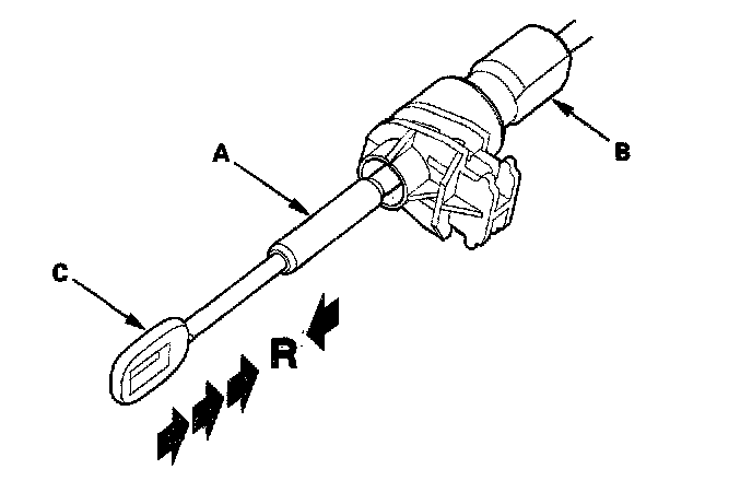 5. Push the shift cable until it stops, then release it. Pull the shift cable back one step so that the shift position is in R. Do not hold the shift cable guide (A) and damper (B) to adjust the shift cable (C).