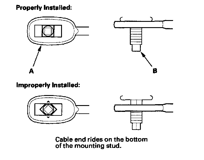 10. Verify that the shift cable end (A) is properly installed on the mounting stud (B).