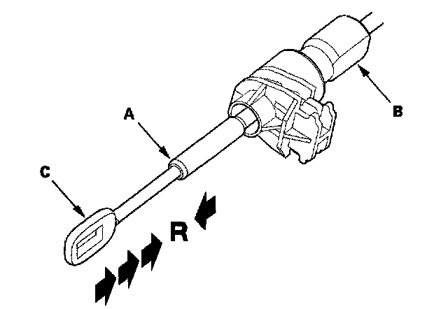 23. If necessary, push the shift cable until it stops, then release it. Pull the shift cable back one step so that the shift position is in R. Do not hold the shift cable guide (A) and damper (B) to adjust the shift cable (C).