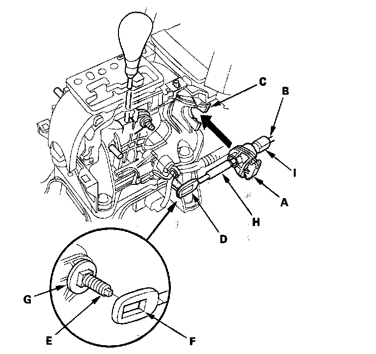 26. Align the socket holder (A) on the shift cable (B) with the slot in the bracket base (C), then slide the holder into the base. Install the shift cable end (D) over the mounting stud (E) by aligning its square hole (F) with the square fitting (G) at the bottom of the stud. Push the holder until it snaps securely in place. Do not install the shift cable by holding the shift cable guide (H) and damper (I).
