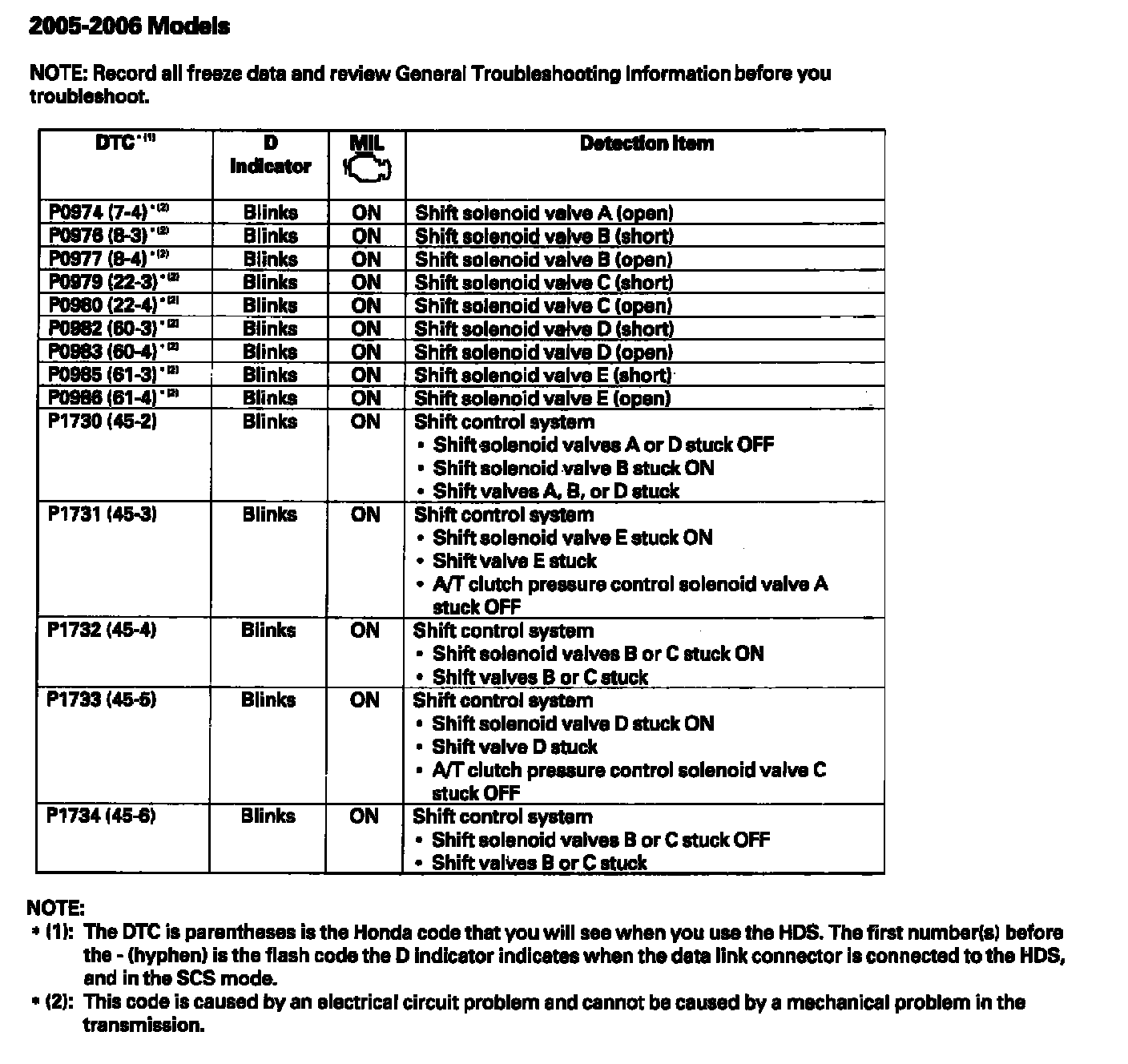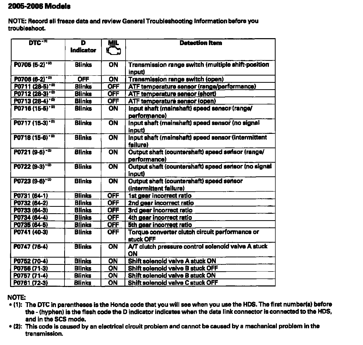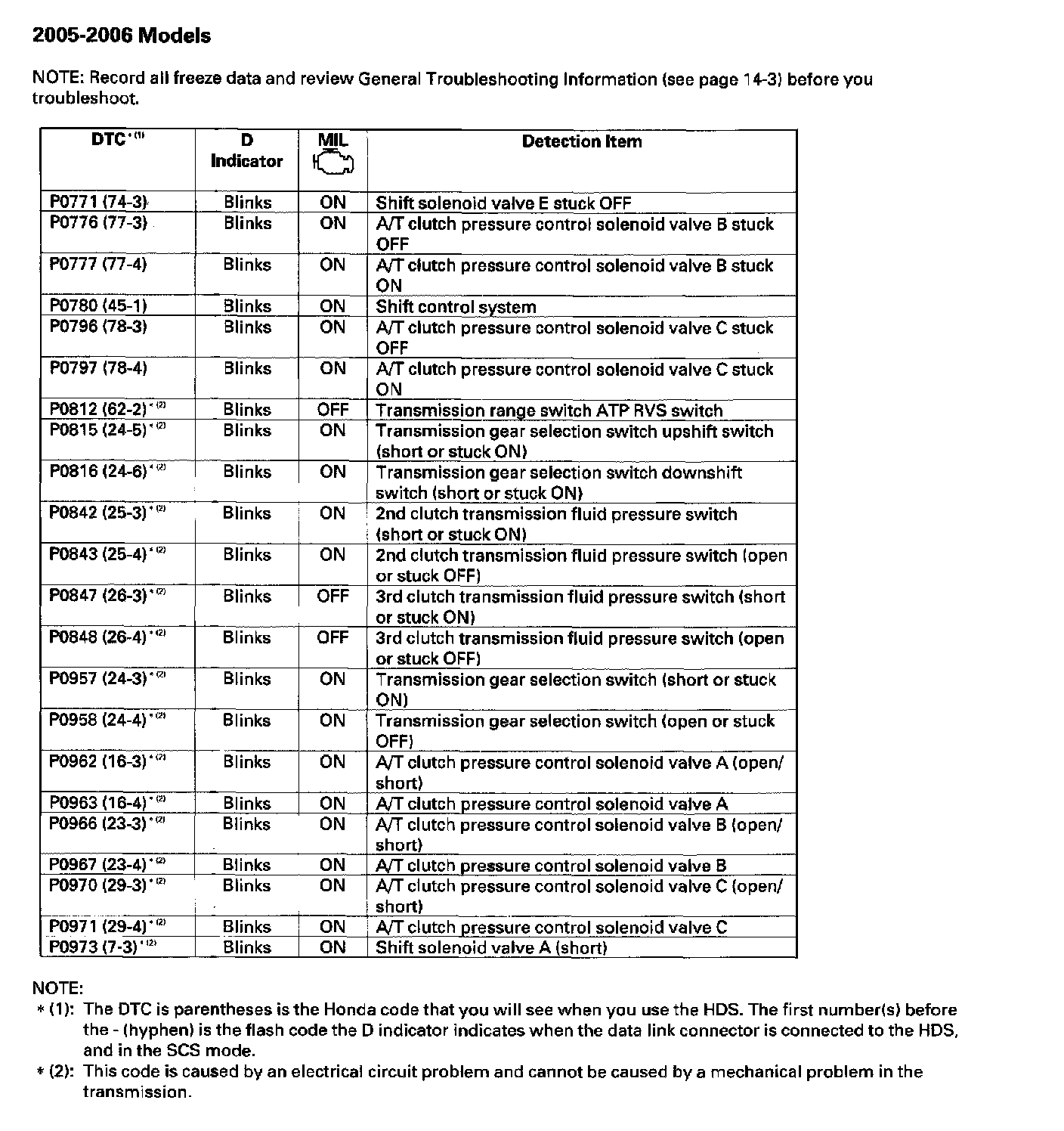 (1): The DTC in parentheses is the Honda code that you will see when you use the HDS. The first number(s) before the - (hyphen) is the flash code the D indicator indicates when the data link connector is connected to the HDS, and in the SCS mode.