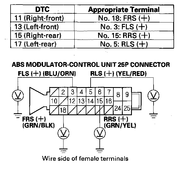 3. Measure the voltage between the appropriate wheel sensor (+) circuit terminal of the ABS modulator-control unit 25P connector and body ground (see table).
