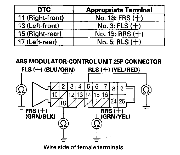 7. Check the resistance between the appropriate wheel sensor (+) and (-) circuit terminals of the ABS modulator-control unit 25P connector (see table).