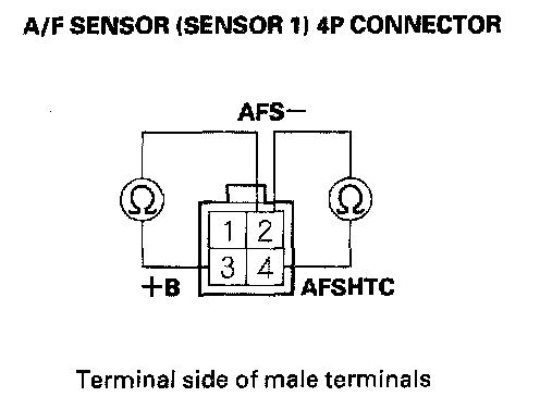 8. At the A/F sensor side, measure resistance between A/F sensor (Sensor 1) 4P connector terminals No. 3 and No. 4.