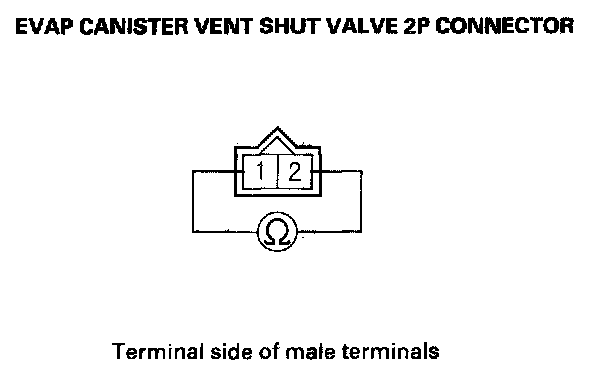 8. Measure resistance between EVAP canister vent shut valve 2P connector terminals No. 1 and No. 2.