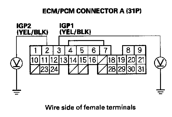 16. Measure voltage between body ground and ECM/PCM connector terminals A3 and A2 individually.