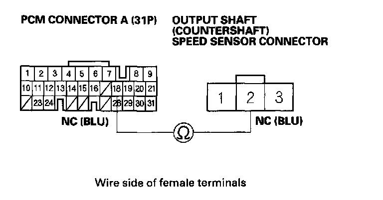 17. Check for continuity between PCM connector terminal A18 and output shaft (countershaft) speed sensor connector terminal No. 2.