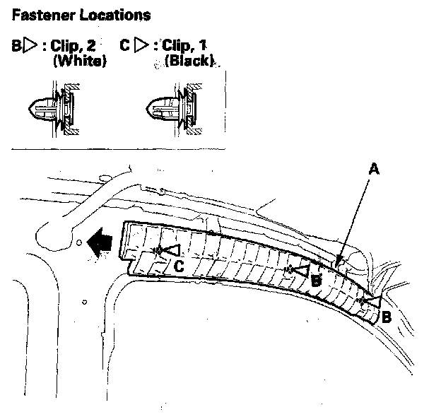 - Using a clip remover, detach the remaining clips from the body, and replace any damaged or stress-whitenings clips . Before reinstalling the roof side pad and headliner, install the clips on the pad and headliner, and fit the clips into the holes in the body, then push on the pad or headliner until the clips snap into place.