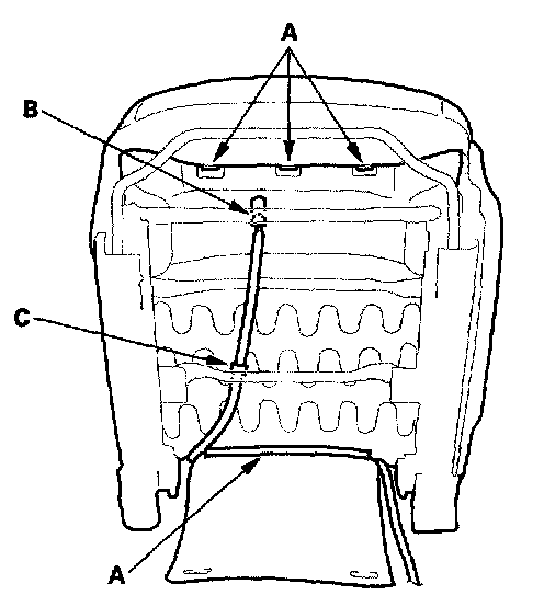 6. From under the seat cushion, release the hooks (A). If equipped with a seat heater, detach the seat cushion heater connector clip (B), and remove the harness band (C).