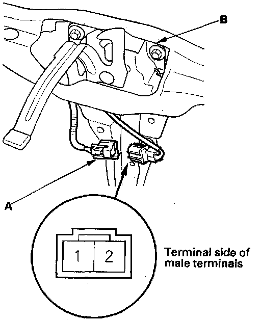 Hood Switch Test1. Open the hood, and disconnect the 2P connector (A) from the hood switch (B).