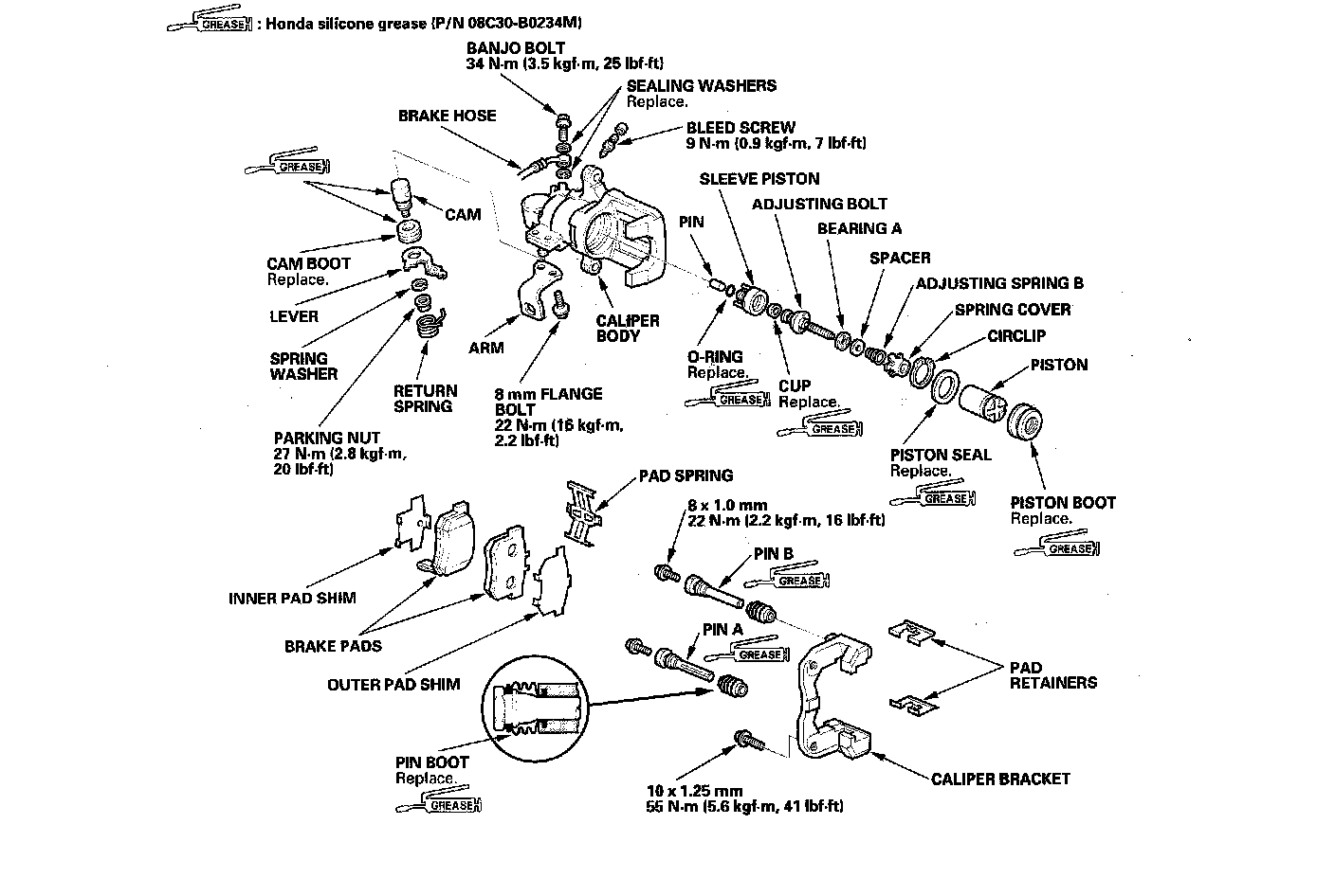 Rear Brake Caliper OverhaulCAUTION: Frequent inhalation of brake pad dust, regardless of material composition, could be hazardous to your health.