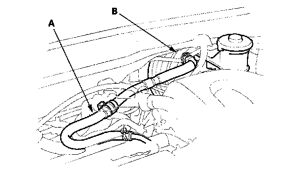 3. Disconnect the brake booster vacuum hose (check valve built-in) (A) at the booster (B) side.