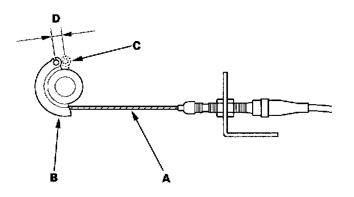 2. Measure the amount of movement of the output linkage (B) until the engine speed starts to increase. At first, the output linkage should be located at the fully closed position (C). The free play (D) should be 3.75±0.5 mm (0.15±0.02 in.).