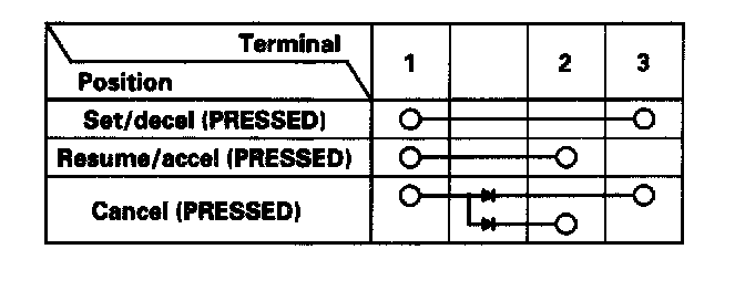 - If there is continuity, and it matches the table, but switch failure occurred on the cruise control unit input test, check and repair the wire harness on the switch circuit.
