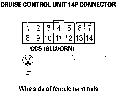 8. Connect a voltmeter between cruise control unit 14P connector terminal No. 8 and body ground. Test-drive the vehicle at speeds over 25 mph (40 km/h) with the cruise control set, and watch the voltmeter.