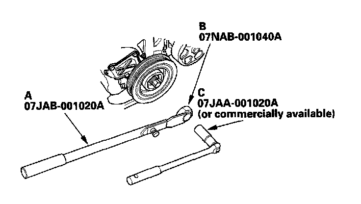 3. Tighten the bolt to 49 Nm (5.0 kgf-m, 36 ft. lbs.) with a torque wrench and 19 mm socket (C). Do not use an impact wrench.