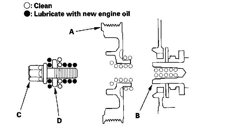 1. Clean the crankshaft pulley (A), crankshaft (B), bolt (C), and washer (D). Lubricate with new engine oil as shown.