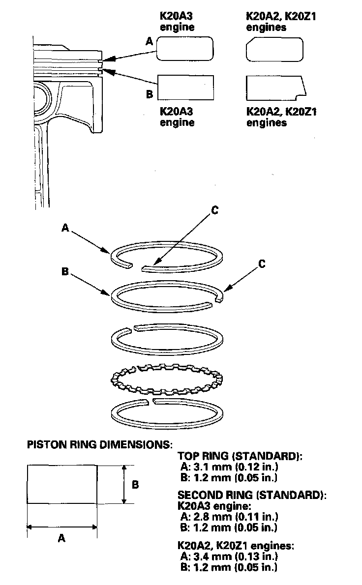 5. Measure the piston ring end-gap (B) with a feeler gauge: