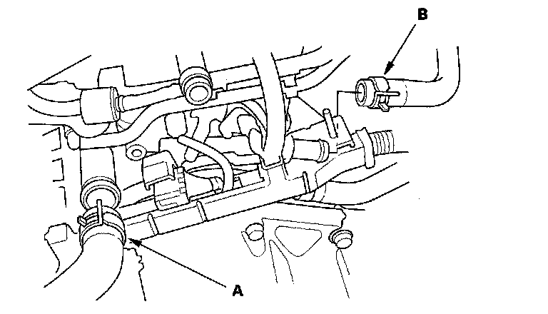 10. Remove the upper radiator hose (A) and heater hose (B).