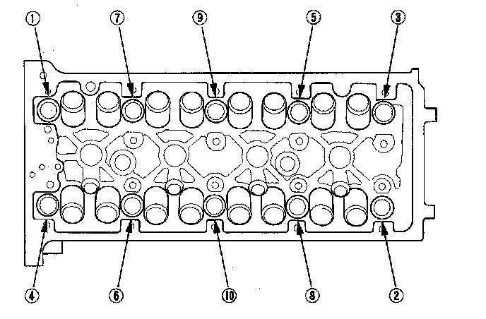 14. Remove the cylinder head bolts, To prevent warpage, unscrew the bolts in sequence 1/3 turn at a time; repeat the sequence until all bolts are loosened.