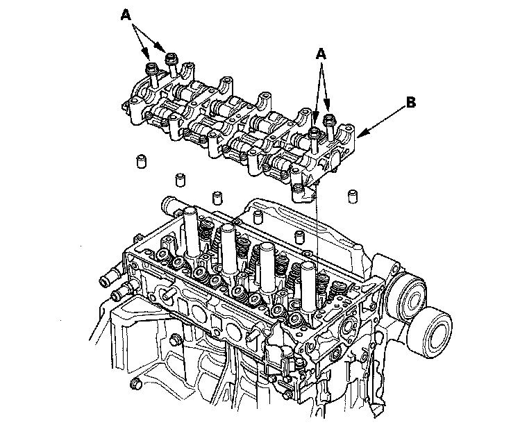 4. Insert the bolts (A) into the rocker shaft holder, then install the rocker arm assembly (B) on the cylinder head.
