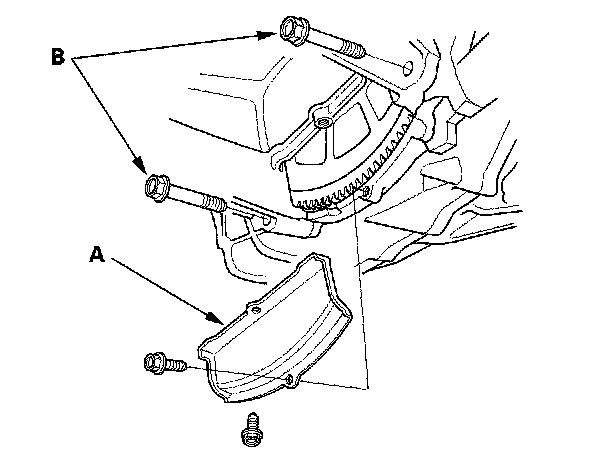 2. Remove the clutch cover (A), and remove the two bolts (B) securing the transmission.