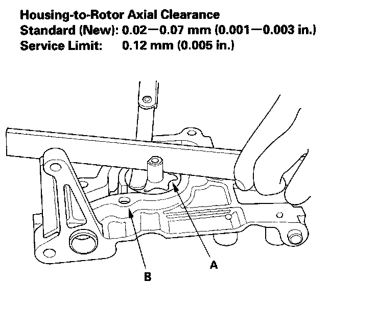 3. Check the housing-to-rotor axial clearance between the rotor (A) and pump housing (B). If the housing-to-rotor axial clearance exceeds the service limit, replace the oil pump.