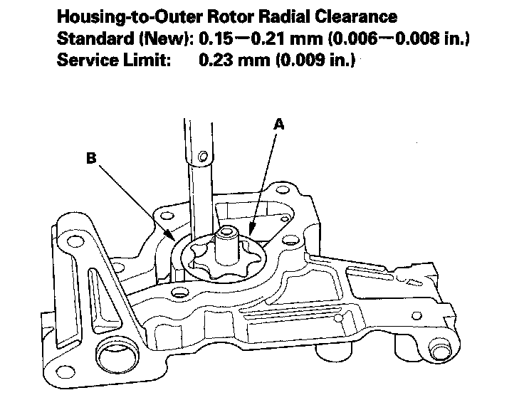 4. Check the housing-to-outer rotor radial clearance between the outer rotor (A) and pump housing (B). If the housing-to-outer rotor radial clearance exceeds the service limit, replace the oil pump.