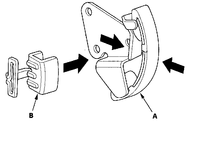 2. Squeeze the new oil pump chain tensioner (A), then install the set clip (B) on it as shown.