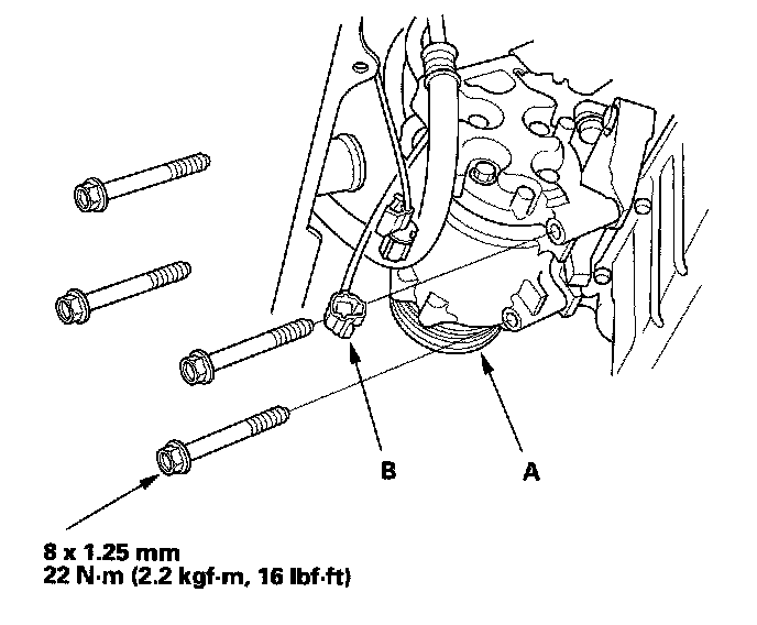 3. Install the A/C compressor (A), and connect the compressor clutch connector (B).