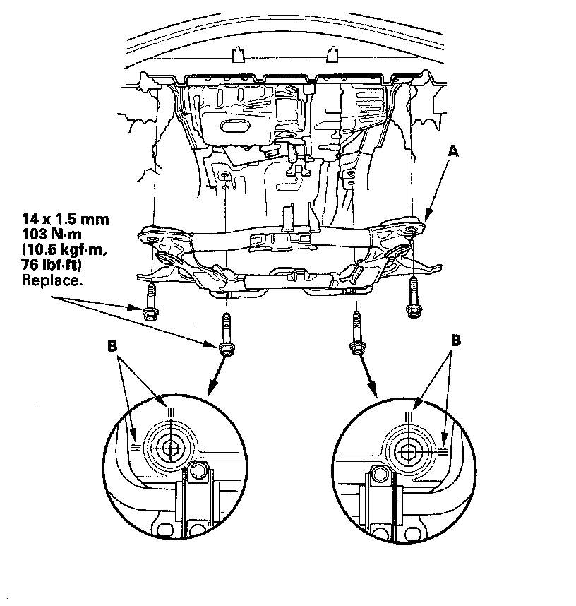 4. Install the subframe (A). Align the reference lines (B) on the subframe with the bolt head center, then tighten the bolts.