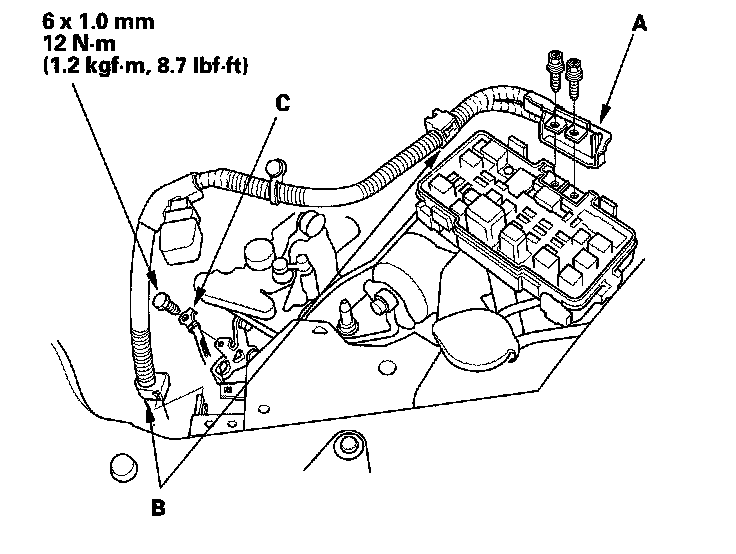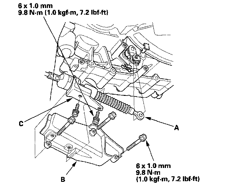 16. Install the shift cable cover (B), then install the shift control cable bracket (C) (A/T).