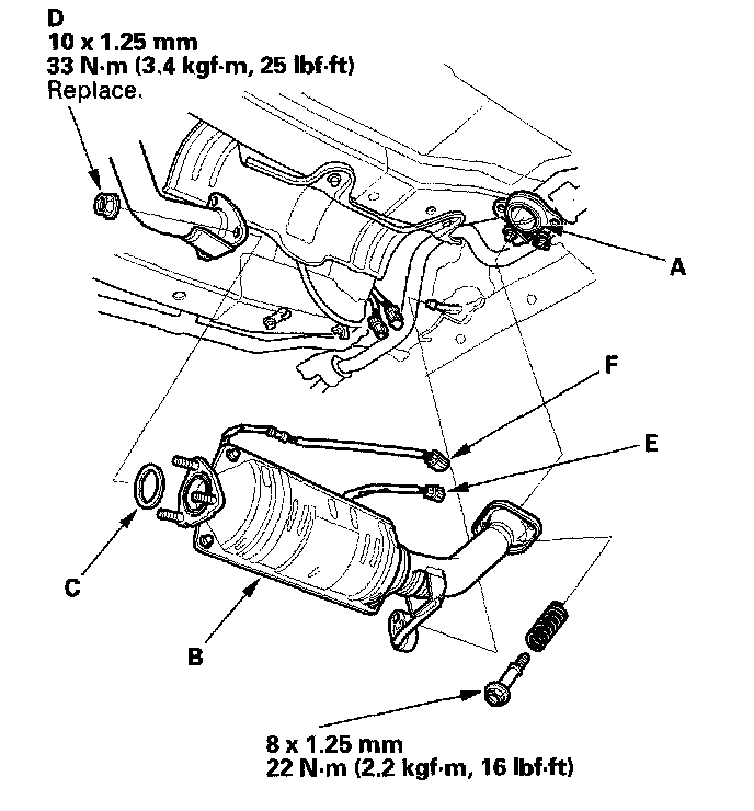 20. Install the three way catalytic converter (TWC) assembly (B); use new gasket (C) and new self locking nuts (D).