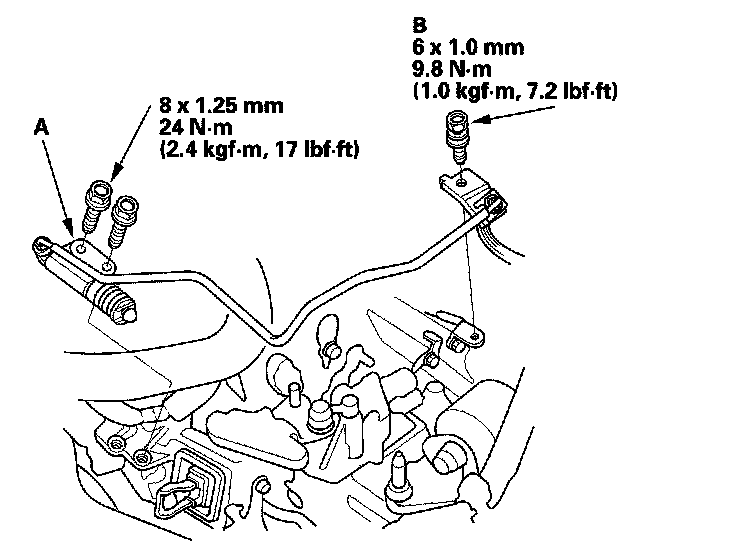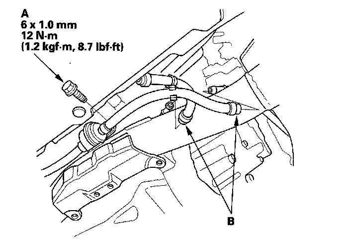 24. Tighten the automatic transmission fluid (ATF) filter mounting bolt (A), and install the ATF cooler hoses (B) (A/T).