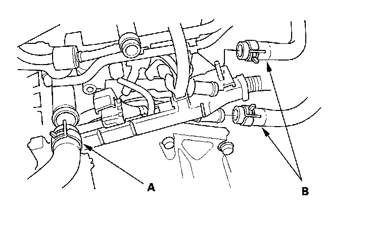 27. Install the upper radiator hose (A) and heater hoses (B).