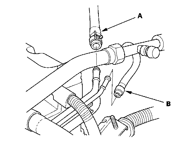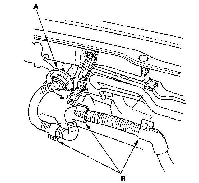 36. Install the brake booster vacuum hose (A) and the evaporative emission (EVAP) canister hose (B).