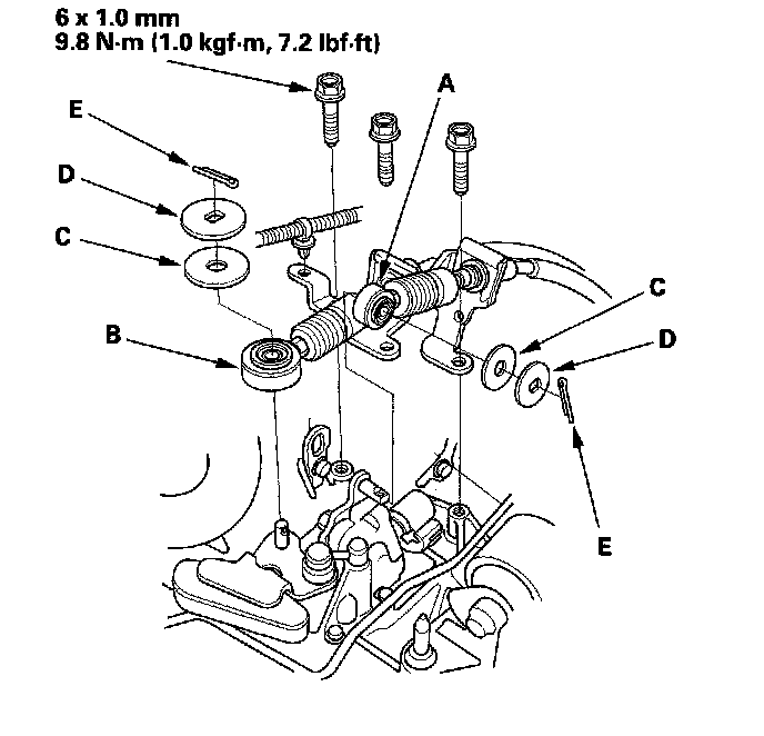 38. Install the select cable (A) and shift cable (B) using the plastic washers (C), washers (D), and new cotter pins (E) (M/T).