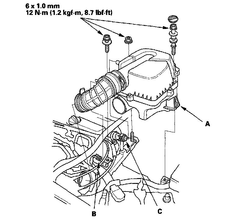 43. Install the air cleaner housing (A) and connect the intake air temperature (IAT) sensor connector (B).
