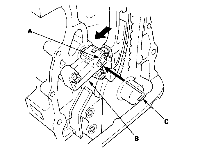 18. Align the holes on the lock (A) and the auto-tensioner (B), then insert a 1.2 mm (0.05 inch) diameter pin or lock pin (P/N 14511-PNA-003) (C) into the holes. Turn the crankshaft clockwise to secure the pin.