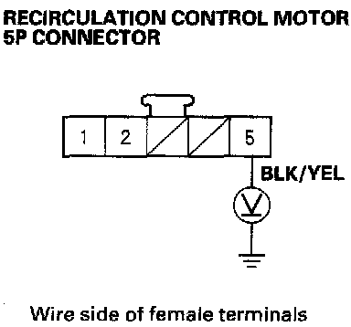 4. Measure the voltage between the No.5 terminal of the recirculation control motor 5P connector and body ground.