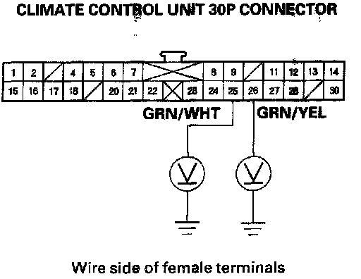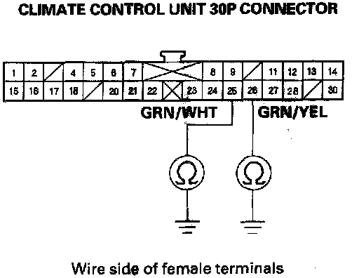 8. Check for continuity between the No.25 and No.26 terminals of the climate control unit 30P connector and body ground individually.