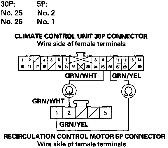 11. Check for continuity between the above terminals of the climate control unit 30P connector and the recirculation control motor 5P connector.