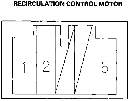 2. Connect battery power to the No.5 terminal of the recirculation control motor, and ground the No.1 or No.2 terminal; the recirculation control motor should run smoothly. To avoid damaging the recirculation control motor, do not reverse power and ground. Disconnect the No.1 or No.2 terminal from ground; the recirculation control motor should stop at Fresh (when the No.1 terminal is disconnected) or Recirculate (when the No.2 terminal is disconnected). Don't cycle the recirculation control motor for a long time.