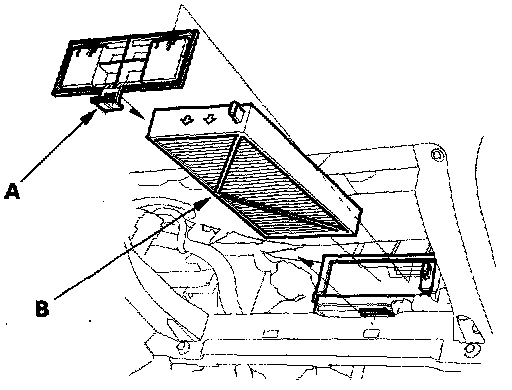 2. Remove the filter lid (A) from the blower unit, then pull out the first dust and pollen filter (B). Slide the second filter to the left, and pull it out.