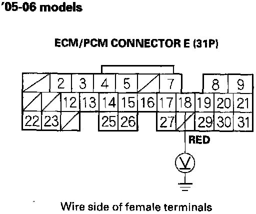 13. Using a backprobe set, measure the voltage between the No.18 terminal of ECM/PCM connector E (31 ) and body ground with the ECM/PCM connectors connected.